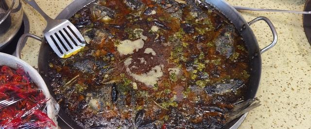 它家的名字就叫萃香园熬鱼,特质菜虽然等于熬鱼,大堂黑铁锅里熬着满满的一锅玄色的鱼。
