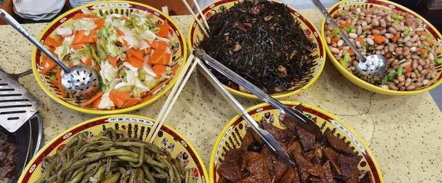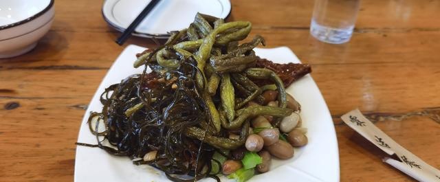 傍边还有几种特质凉拌小菜,有泡菜,海带丝,豆腐,长豆角。