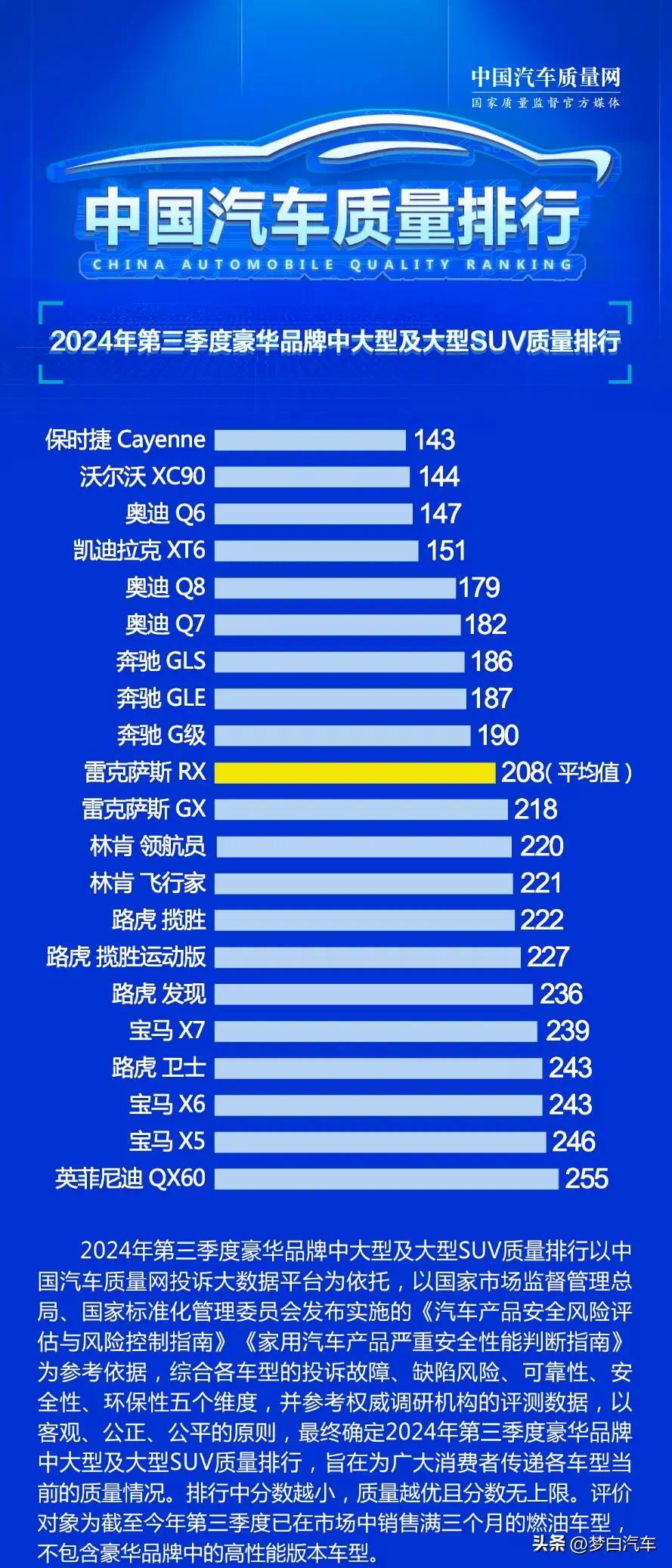 再来看下豪华中大型及大型SUV的上榜情况,共有21款主流车型入榜,质地达场合车型唯有10款,保时捷卡宴荣登榜首,沃尔沃XC90和奥迪Q6分列二三位,三款车型的质地排名分数齐未逾越150,凯迪拉克XT6的品控进展也处于一线梯队。奥迪Q7、飞驰GLS、飞驰GLE以及飞驰G级也齐是入榜前十名。