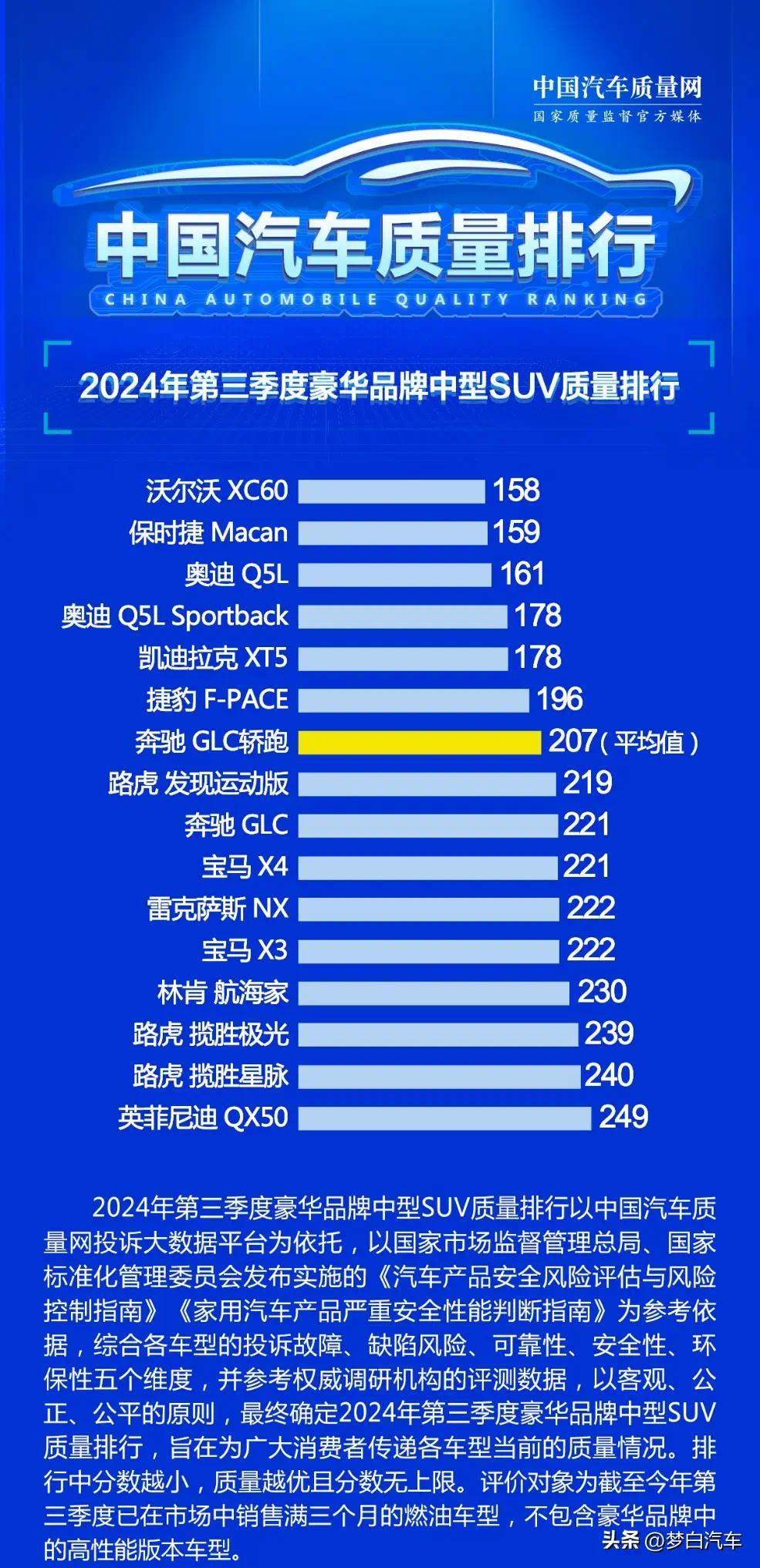 先来了解下豪华中型SUV的上榜情况,本期榜单共有16款车型入榜,其中有7款车型的质地排名分数低于或即是行业平均值。沃尔沃XC60再次完好意思了卫冕,保时捷Macan屈居次席,它们俩的质地排名分数齐低于160,依然相比令东说念主安闲的。豪华SUV销量冠军奥迪Q5L赢得了季军,它的畅通版车型奥迪Q5L Sportback夺得第四,凯迪拉克XT5、捷豹F-PACE和飞驰GLC轿跑分列五至七名,质地进展也达到了行业主活水准。