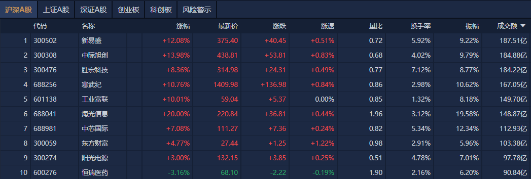 个股方面,新易盛成交额超187亿元居首,中际旭创、胜宏科技、寒武纪成交额靠前。