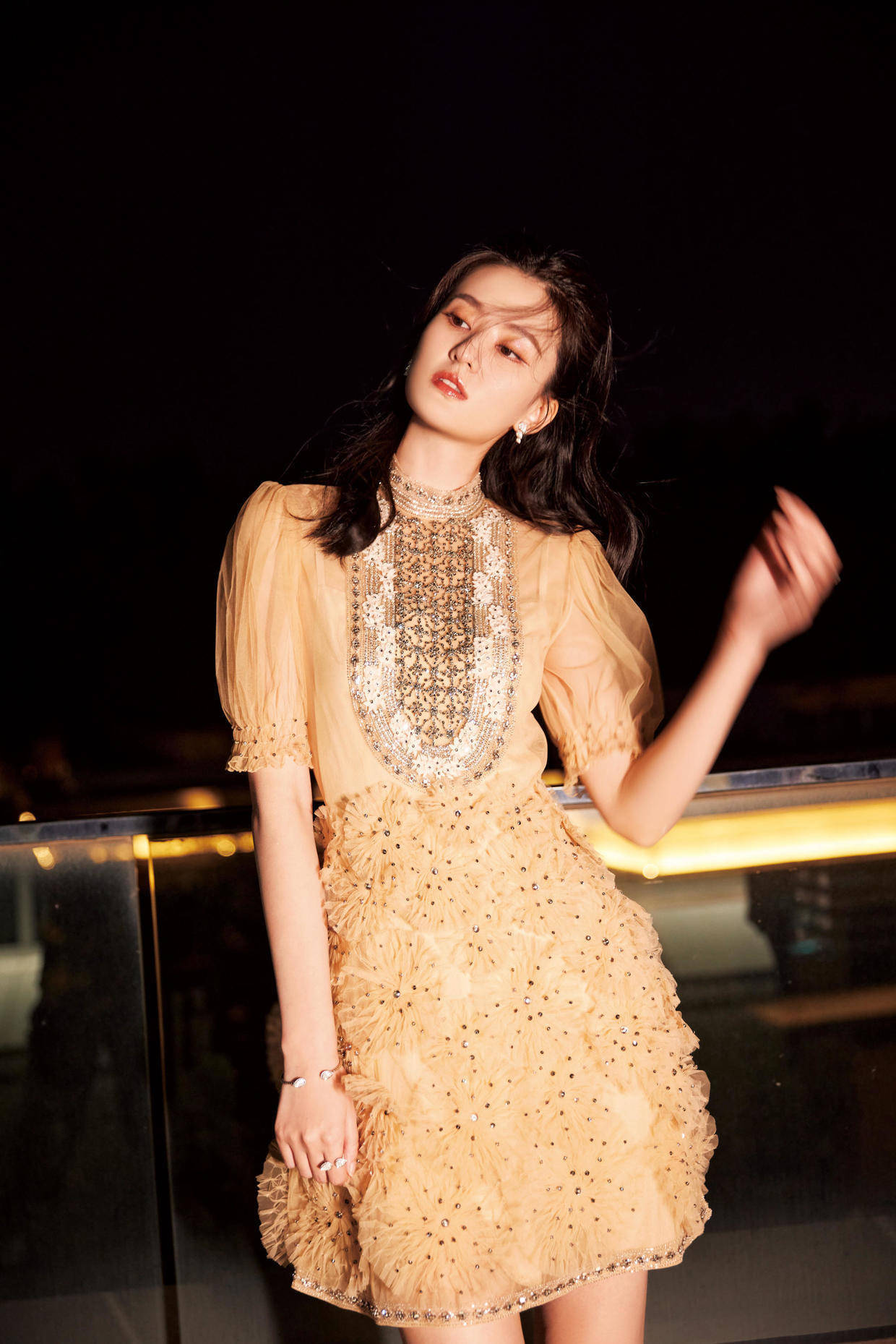 像乔欣这个年龄的仙女,可搭配空间照旧挺大的,只需要在裙装中融入一些小小的细节就能松开成为全场的C位,乔欣的这两款裙装搭配很值得模仿,前者以黄色为主色调,在其中融入了轻纱雪纺面料,并点缀了多少立体的褶皱、亮钻,这么更有忍让的气质,还会衬托出穿搭者更饱和的精气神。