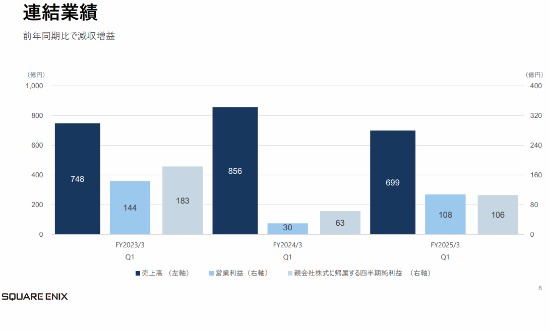 当天(8月6日),SQUARE ENIX公布了24-25财年Q1(本年4月至6月)财报。数据涌现,本季度销售额为699.15亿日元(约为34.37亿东说念主民币),与2024财年Q1同时对比着落了18.4%,买卖利润达到了108.44亿日元(约为5.33亿东说念主民币),同时增长250.1%。确定请点击>>>