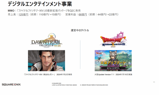 MMO方面则竣事了销售额、销售利润双增长,销售额为125亿日元,销售利润为66亿日元。《最终幻思14》最新大型贵府片“7.0黄金的遗产”已于2024年7月2日发售,而《勇者斗恶龙10》7.1版块大型更新也在2024年7月10日上线。