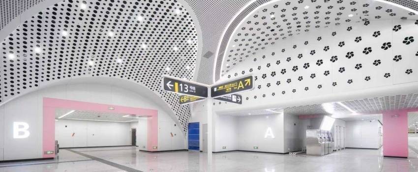 踏入金融城北站,车站线条灵动舒展,光源疏密交错,交子光电玻璃上光影流转,营造出数字金融科技氛围。