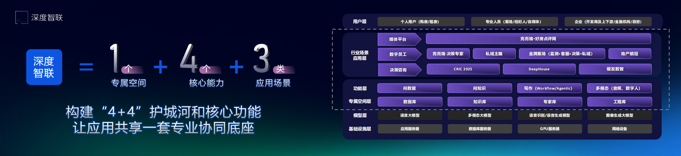 值此要道节点,深度智联在“2025寰宇开拓者前锋大会(GDPS2025)·房地产产业东说念主工智能大会”上,认真发布 “地产AI-Ready”计策,系统推出以 “四大中枢库” 为基座的 “AI专属空间” ,以及狡饰三类业务场景的好意思满居品矩阵,初次好意思满呈现 “1个专属空间、4大中枢才能、3层期骗场景” 的系统级措置决策。