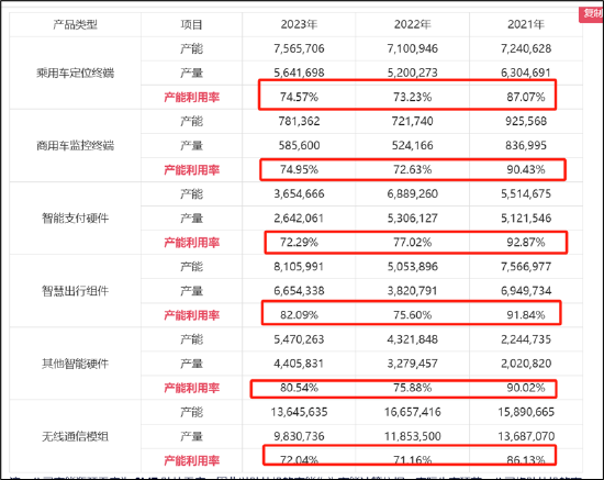 咱们发现,公司的乘用车定位中端家具产能期骗率由2021年的87.07%大幅下落至2023年的74.57%;商用车监控末端产能期骗率由2021年的90.43%下落至74.95%;智能支付硬件产能期骗率也由此前的92.87%下落至72.29%。