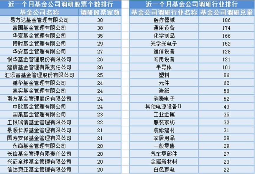 近一个月(1月20日-2月19日),易方达基金参与公司调研的数目最多,共调研38家上市公司,然后调研较为活跃的还有富国基金、中原基金和博时基金,分袂调研38家、35家、29家上市公司;从调研行业上来看,基金公司对医疗器械行业的上市公司调研次数最多,共有186次,其次是通用成就行业,基金公司调研了174次。