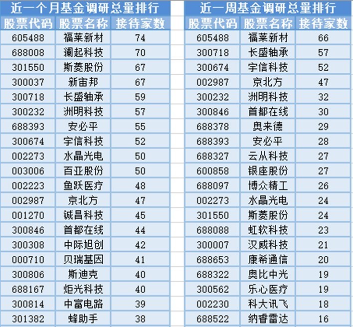 将时辰周期镌汰到最近一周(2月12日-2月19日)来看,基金调研数目第一的公司是福莱新材,属于橡胶和塑料成品业,主贸易务为功能性涂布复合材料的研发、分娩和销售;姜被66家基金机构调研。然后被调研数目较多的股票是长盛轴承、宇信科技和京朔方,分袂采纳57家、52家和47家基金机构的调研。