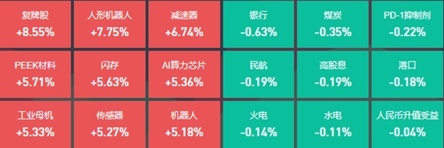 2月19日A股三大指数集体上升,截止收盘云开体育,沪指涨0.81%,报3351.54点,深成指涨1.46%,报10772.65点,创业板指涨2.03%,报2226.98点。从板块行情上来看,本日确认较好的有东说念主形机器东说念主、复牌股和降速器,而银行、煤炭和民航等板块着落。