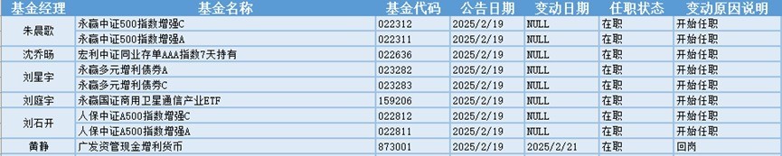 新基金司理上任方面,永赢基金朱晨歌现任基金金钱总限制为0.21亿元,处置过的基金多为指数型和夹杂型基金,任员工夫答复最高的居品是汇安宜创量化精选夹杂A(008251),为夹杂型基金,在职职的1年又41天时辰内赢得66.15%的答复。新上任永赢中证500指数增强A、永赢中证500指数增强C这两只基金居品的基金司理。