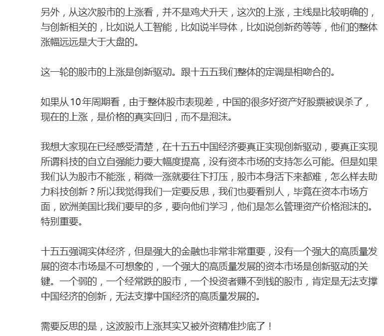 他号召鉴戒外洋训诲:“咱们一定要反想,咱们也要看别东说念主,毕竟在成本市集方面,欧洲好意思国比咱们要早的多,要向他们学习,他们是怎么措置钞票价钱泡沫的。”并强调:“十五五强调实体经济,关联词弘大的金融也特地特地蹙迫,莫得一个弘大的高质料发展的成本市集是不可假想的,一个弘大的高质料发展的成本市集是翻新驱动的关键。”终末,他点出市集实验:“需要反想的是,这波股市上升其实又被外资精确抄底了!”